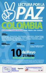 With readings of poems, among other activities, May’s worldwide poetic action for peace in Colombia has been joined by organizations such as: Festival Internacional de Poesía de La Habana (Cuba), Fondation Prokilti (Haití), Festival Internacional de Poesía de Medellín, Teatro La Candelaria, Casa Museo Fernando González, Casa de Poesía del Valle Jorge Isaacs, Fundación Plenilunio, Colegio Gimnasio Fontana, Universidad Sergio Arboleda de Santa Marta, Universidad de Cartagena, Corporación Sociocultural PezcArte de Riohacha (Colombia), Desembarco Poético and Asociación de Escritoras Contemporáneas del Ecuador (Ecuador), Movimiento Comunal Nacional (República Bolivariana de Venezuela), Festival Latinoamericano de Poesía en el Centro, Fundación Floreal Gorini, Festival por la Paz de Santa Fe and Sociedad Argentina de Artistas Plásticos (Argentina), Fragua Thomas Sankara de la Casa Hankili and Festival Iberoamericano de Poesía Salvador Díaz Mirón (Mexico), Escuela de Estudios Generales de la Universidad de Costa Rica (Costa Rica), Brigadas de Poetas Revolucionarios (San Francisco, Estados Unidos and Roma, Italia), Harare International Festival of Arts (Zimbabwe), International Poetry Festival a Spier and Barefoot Poets Poetry Reading (Suráfrica), West Africa for the OWWA, Women Writers Conference y Splendors of Dawn (Ghana), Contemporary Poet and Writers Association of Turkey (Turquía), International Poetry Festival of Krytia, Poetrywala in Mumbai (India), Press Club of Dakka (Bangladesh), MetroManila on programm Happy Mondays in Quezon City (Philippines), International Human Rights Defender Network (Siria), Festival Internacional de Poesía de Granada, el Departamento de Cultura del Ayuntamiento de Bilbao and Asociación Cultural Arte Fénix (España), La Maison de l'Amérique Latine, Radio Bumerang and La Vache Bleu (París, Francia), Poets Circle and Volos Poetry Slam (Grecia), Nelversogiusto-Senigallia Poetry (Italia), The International Poetry Festival Meridian Czernowitz (Ucrania), Writers Union House (Islandia), International Literary Symposium (Eslovenia), Zagreb City Library, Writers Society and Croatian P.E.N. Centre (Croacia), Annikki Poetry Festival (Finlandia) Writers’ Union of Romania (Rumania) and Turkish-Cypriot Artists and Writers Union (Chipre).