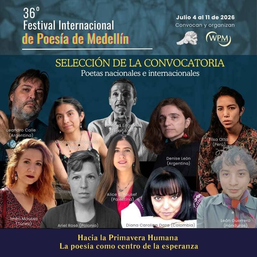 El jurado del proceso de selección de poetas internacionales para la edición 36 del Festival Internacional de Poesía de Medellín, integrado por tres miembros, Soledad Fariña, Gabriel Franco y María Sánchez, se reunió para deliberar sobre las obras recibidas en el marco de esta convocatoria. Tras un proceso de lectura atenta, diálogo y contraste de criterios, el jurado ha decidido seleccionar diez poetas que participarán en la próxima edición del festival, que se celebrará del 4 al 11 de julio de 2026.